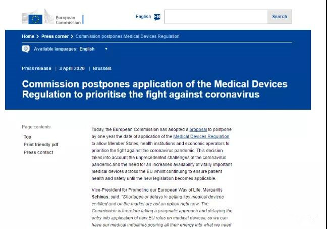 继3月25日,欧盟发言人提出正在研究将欧盟医疗器械新法规MDR的执行时间推迟一年的提议。今天,欧盟委员会正式通过该项提案,确定将新版医疗器械MDR法规的实施日期推迟一年,也即于2021年5月26日强制实施。